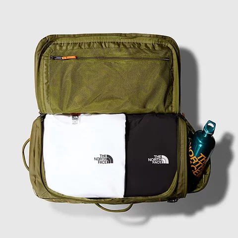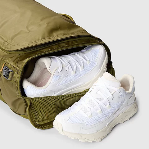 Amplia: Esta bolsa ofrece mucho espacio para lo esencial y las pertenencias cotidianas. Nuestra icónica Base Camp Duffel es la inspiración de la nueva Voyager. Es igual de práctica, pero pesa menos y tiene aún más bolsillos para guardar tus cosas, con un enfoque más centrado en los viajes que en las expediciones de ida y vuelta. Puedes llevarla como mochila o como bolsa de viaje. Tiene una funda para el portátil, un separador ajustable y extraíble en la sección principal, que sin duda facilita la separación entre lo limpio y lo sucio, y -para evitar rebuscar frustradamente- un bolsillo exterior con cremallera para el pasaporte y el teléfono. Además, está fabricada con tejido reciclado.